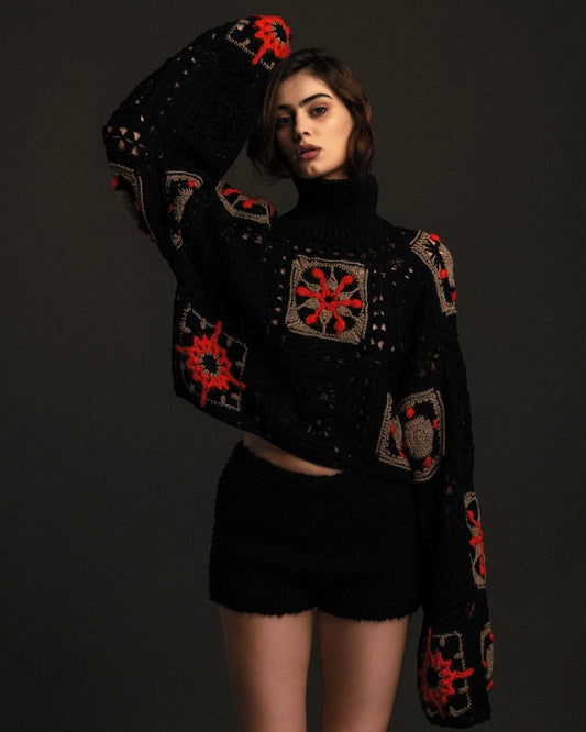 Black Turtleneck Sweater, Knitted Turtleneck Sweater, Granny Square Pullover, Black Crochet Sweater, Boho Crochet Tops